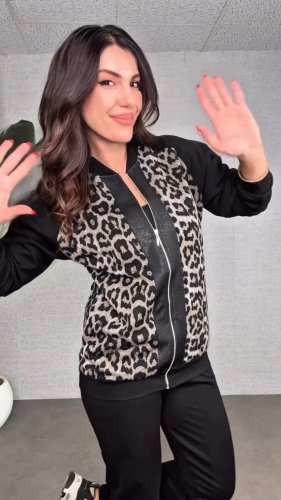• Kadın uzun kollu önden fermuarlı leopar desenli viskon iki iplik bluz ve pantolon ikili takım
